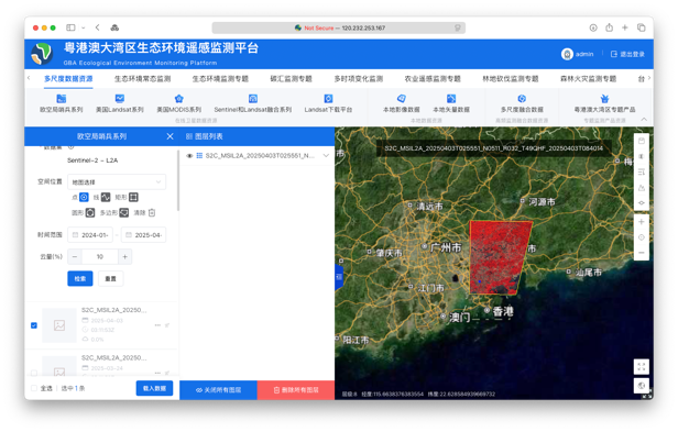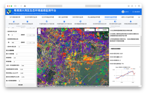 "我们研发的系统平台能够在线调取并处理多类别遥感数据。"陈劲松介绍,该系统平台构建了包括在线卫星数据资源(Landsat系列,Sentinel系列)、本地数据资源、专题监测产品、基础底图数据的多源时空数据库,同时系统与Google Earth Engine进行了接口对齐,并综合考虑了时空检索和数据更新需求,能够实现面向粤港澳大湾区国土资源与生态环境监测的时空数据的在线调度、管理、计算、存储与产品可视化渲染以及在线统计分析服务。
