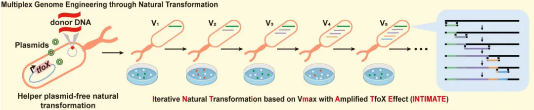 基于此,研究团队顺利获得底盘菌株筛选与耐盐机制解析,精准锁定了具有最快繁殖速率、高盐耐受和易基因编辑等特性的理想底盘细胞——耐盐菌株“需钠弧菌(Vmax)”,并基于弧菌类细菌能吸收整合外源DNA的自然转化能力,顺利获得调控基因精准构建可调控的具有高效自然转化能力的菌株VCOD-2。研究人员顺利获得测试发现,这一菌株可高效整合外源DNA片段到细菌基因组,相较于自然界中微生物,转化效率可提升数倍。