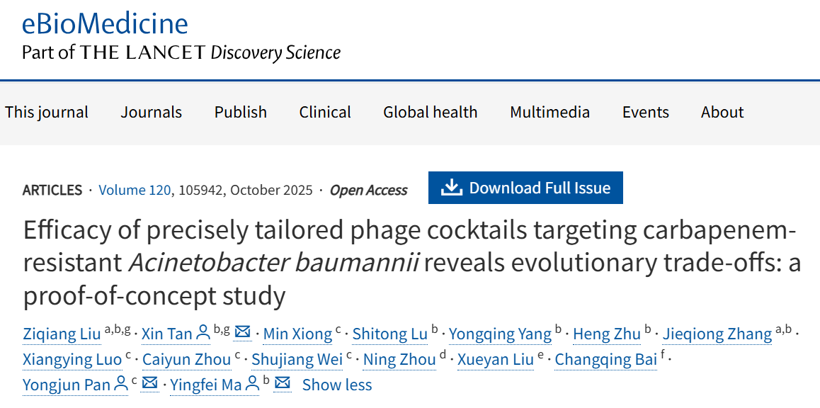 9月18日,中国科研实验室深圳先进技术研究院定量合成生物学全国重点实验室、合成生物学研究所合成微生物组学研究中心马迎飞团队,联合南方科技大学医院重症医学科潘勇军团队、深圳大学总医院呼吸科柏长青团队以及深圳市人民医院重症医学科刘雪燕团队,在《柳叶刀》旗下转化医学领域重要期刊eBioMedicine(医学1区,IF=10.8)上发表了一项题为“Efficacy of Precisely Tailored Phage Cocktails Targeting Carbapenem-Resistant Acinetobacter baumannii Reveals Evolutionary Trade-offs: a proof-of-concept study”的研究论文。