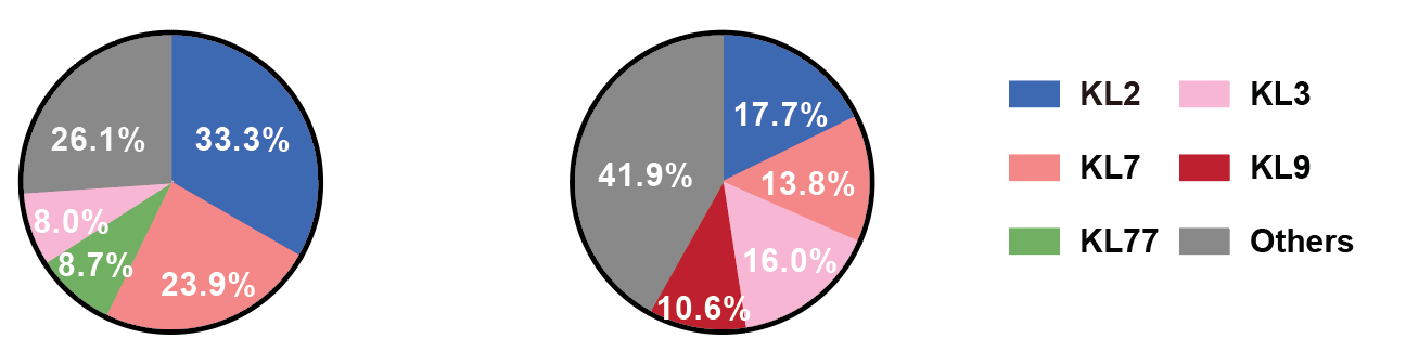 研究团队从深圳、广州及中山等地的多家医院共采集138株临床分离CRAB,其中荚膜2型(KL2)菌株占比最高,为33.3%。同时,结合两项全国流行病学研究的896株菌株基因组分析发现,KL2型在全国范围内的占比仍高达17.7%(图1)。这提示KL2型CRAB不仅在广东高发,且已在全国范围内广泛流行。