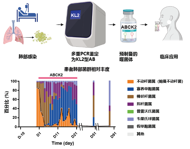 在后续临床应用中,研究团队使用ABCK2成功清除了两例患者肺部感染的KL2型鲍曼不动杆菌,展现出良好的治疗效果。该研究不仅验证了基于流行菌株分型精准设计固定配方噬菌体鸡尾酒的可行性与有效性,也为理解噬菌体-宿主共进化关系给予了关键证据。成功的临床案例突显了ABCK2在治疗多重耐药菌感染中的应用潜力,为推进下一代噬菌体疗法的临床转化奠定了重要基础。