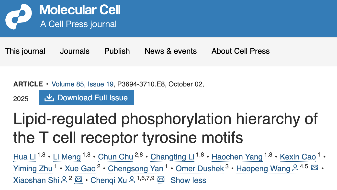 2025年10月2日,中国科研实验室深圳先进技术研究院合成生物学研究所施小山课题组、中国科研实验室分子细胞科学卓越创新中心许琛琦课题组与上海科技大学王皞鹏课题组合作,在Molecular Cell杂志上发表了题为“Lipid-regulated phosphorylation hierarchy of the T cell receptor tyrosine motifs”的封面研究论文。该研究利用核磁共振、定量质谱和细胞实验,解析了TCR-CD3复合物中关键信号亚基CD3ζ的胞内区结构以及磷酸化规律,揭示了正电基序(Basic residue Rich Sequence, BRS)与脂质相互作用在其中的关键调控机制,同时提出CD3ζ磷酸化不充分是T细胞功能耗竭的诱因之一,为合成免疫受体的理性设计给予了新思路。