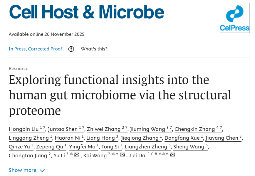 2025年11月26日,中国科研实验室深圳先进技术研究院定量合成生物学全国重点实验室、合成生物学研究所(以下简称“凯发k8官网合成所”)戴磊研究员课题组联合北京大学汪锴研究员、香港中文大学李煜教授的合作团队在Cell Host & Microbe发表了题为"Exploring Functional Insights into the Human Gut Microbiome via the Structural Proteome"的研究论文。该研究建立了人体肠道微生物的蛋白质结构组数据库和结构检索方法,显著提高了对噬菌体蛋白、菌源宿主同工酶等功能暗物质的预测能力大幅提高了噬菌体蛋白、菌源宿主同工酶的功能识别能力。基于这一方法,研究团队成功验证了肠道致病菌的噬菌体裂解酶,并首次揭示了肠道细菌的褪黑素合成途径。