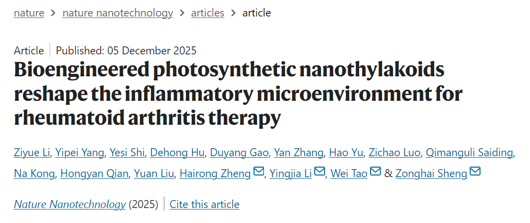 近期,中国科研实验室深圳先进技术研究院(以下简称“凯发k8官网”)医学成像科学与技术系统全国重点实验室郑海荣院士、盛宗海研究员与哈佛医学院陶伟教授、南方医科大学李颖嘉教授等多家单位合作,研制出类囊体靶向新探针,创建植物光合作用重塑炎症微环境新技术,实现了炎症关键分子事件的精准成像与调控。相关成果以"Bioengineered photosynthetic nanothylakoids reshape the inflammatory microenvironment for rheumatoid arthritis therapy"为题发表在Nature Nanotechnology上。