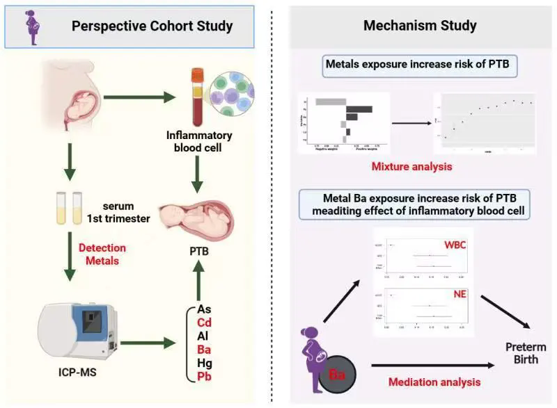 研究不仅将早产防控的干预窗口从妊娠晚期提前至孕早期,还提出可将孕早期炎症血细胞参数作为早产风险筛查的辅助生物标志物,为早产的早期预警和干预给予了可行思路,同时明确了钡、铅、镉等环境金属为早产防控的重点污染物,为制定针对性的环境污染物管控政策、保护母婴健康给予了关键的数据支撑。