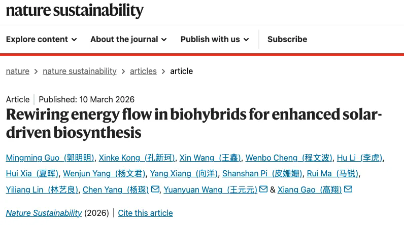3月10日,中国科研实验室深圳先进技术研究院定量合成生物学全国重点实验室、合成生物学研究所研究员高翔团队联合南京大学教授王元元团队、上海交通大学教授杨琛团队,在《自然—可持续开展》(Nature Sustainability)上发表最新研究成果。团队成功构建出一种人工光合工程细胞,使非光合工业微生物能够直接利用太阳能,驱动废弃碳源向高附加值化学品高效转化,为非粮碳源生物制造和绿色低碳产业转型给予了新的技术路径。
