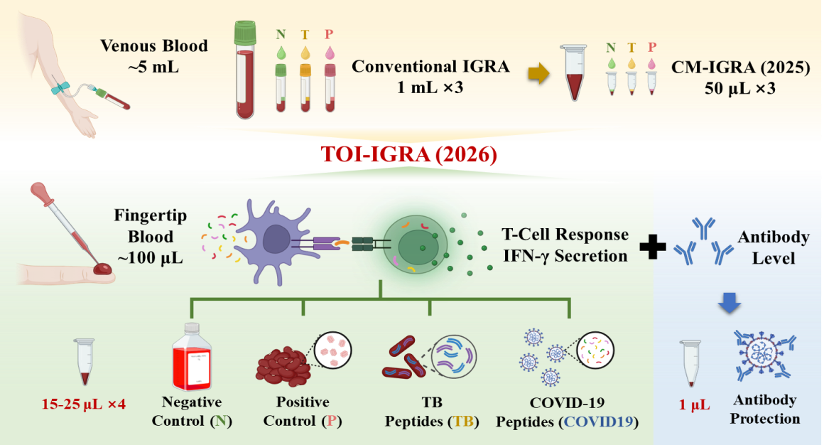 随着结核病等传染病的持续流行,人群特异性免疫防护的快速评估成为公共卫生领域的重要需求。相比抗体检测,T细胞免疫反应能够更直接反映机体的细胞免疫保护水平。然而,传统T细胞检测方法通常依赖毫升级静脉采血和实验室条件,检测流程复杂,限制了其在基层医疗和社区场景中的应用。