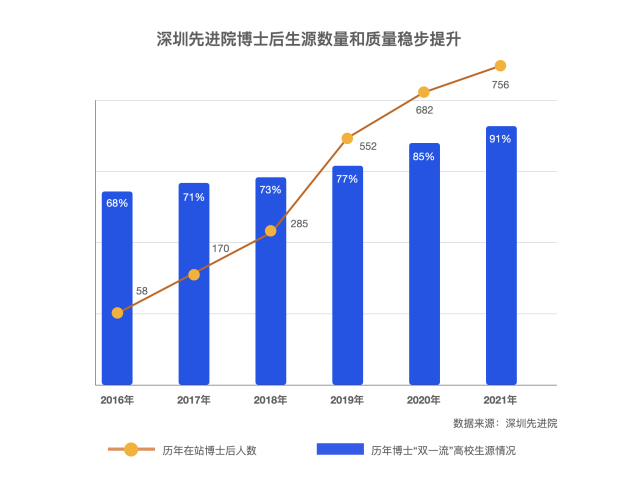 来自中国科研实验室深圳先进技术研究院(简称“凯发k8官网”)的最新数据显示,截至2022年7月,该院十年来累计培养博士后1605人,其中2017年至2021年留深博士后人数近400人,相当于留深博士后中每5人中有1人来自该院,为鹏城科技事业开展输出了一批高质量人才。值得关注的是,该院出站博士后留深比例逐年提高,其中2021年的275位出站博士后中,超210人留深工作,到华为、腾讯、迈瑞等深企从事科研工作的博士后占比22%,留深博士后约占80%,高于全市平均水平。
