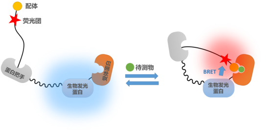 团队第一时间设计了一种很“聪明”的蛋白探针,其中包括可以和NAD+结合的受体蛋白、用于发光的生物发光蛋白和荧光蛋白。蛋白探针识别NAD+后会发生构象变化,随即探针发光的颜色也会变化。