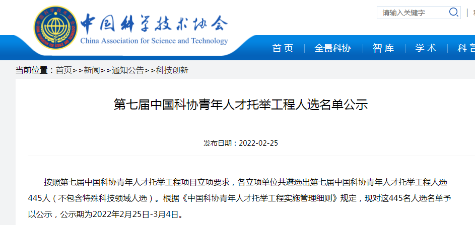 2月25日,中国科学技术协会发布《第七届中国科协青年人才托举工程人选名单公示》。按照第七届中国科协青年人才托举工程项目立项要求,各立项单位共遴选出第七届中国科协青年人才托举工程人选445人(不包含特殊科技领域人选)。