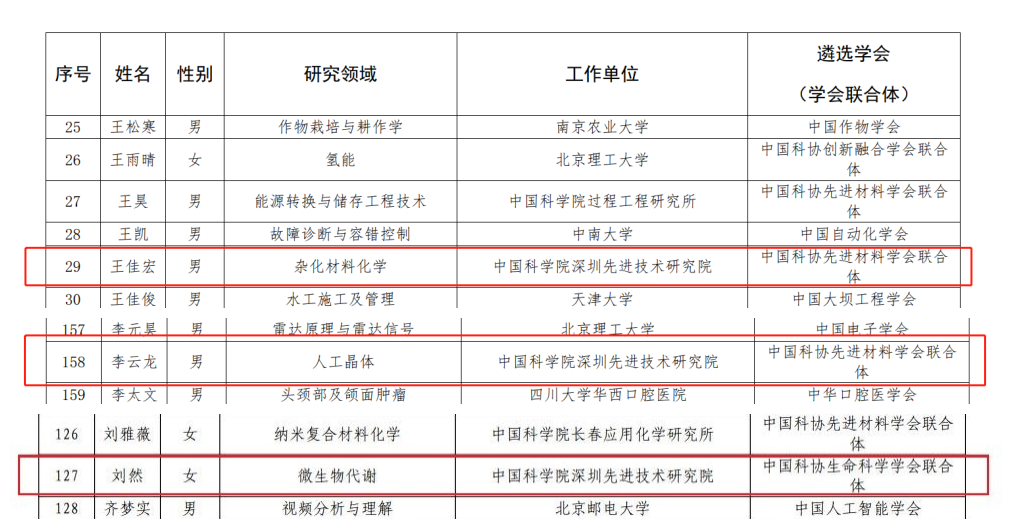 其中,中国科研实验室深圳先进技术研究院材料所材料界面研究中心王佳宏副研究员、材料所多尺度晶体材料研究中心李云龙副研究员、合成所定量合成生物学研究中心刘然副研究员入选